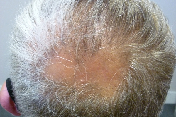 He was diagnosed with scalp psoriasis and prescribed a strong steroid ointment. Although this initially helped calm the inflammation, Trevor soon noticed a large patch of hair loss in the treated area, along with an area of hair turning white. This sudden and unexpected hair loss caused significant emotional distress.